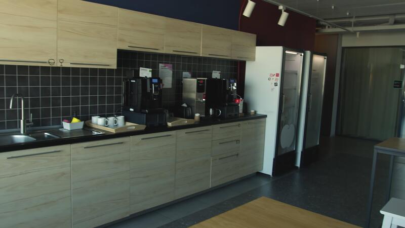 An empty kitchen. Action. Space for cooking and tables with stools in front of mirrors and refrigerators. Pro Video