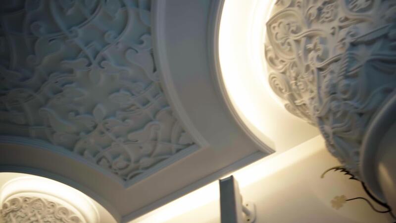 White painted columns. Scene. Beautiful architecture inside the room and beautiful carved patterns on the walls. Pro Video