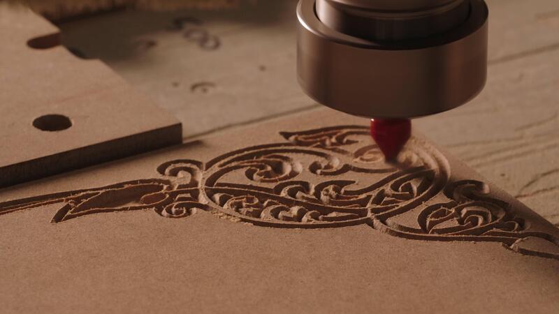 Carving geometric pattern on wooden sheet with small drill at woodwork factory, macro view. Creative. Wood lathe machine processes detail creating sawdust. Pro Video