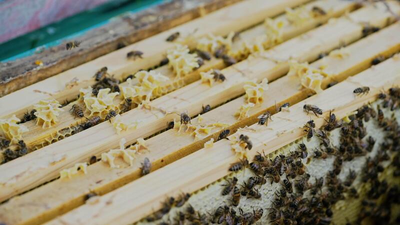 Frames of a beehive. Working bees in a hive. Bees turn nectar into honey. Pro Video