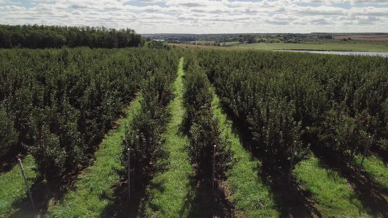Lines of green apple trees growing under the light sky in a summer day. Beautiful landscape with the rows of trees in the field. Camera moves left. Aerial view Pro Video