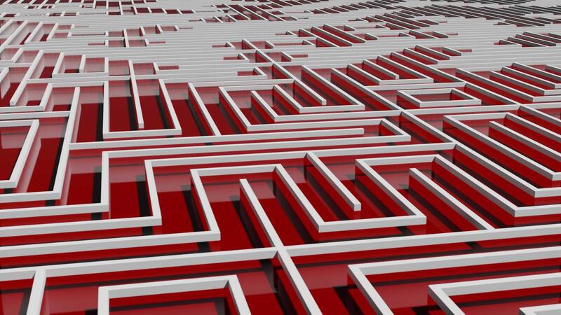 3D background with white maze pattern under glossy red floor with realistic reflections and moving camera effect. Abstract animation for business and office presentation or art performance. 4K 60fps Pro Video