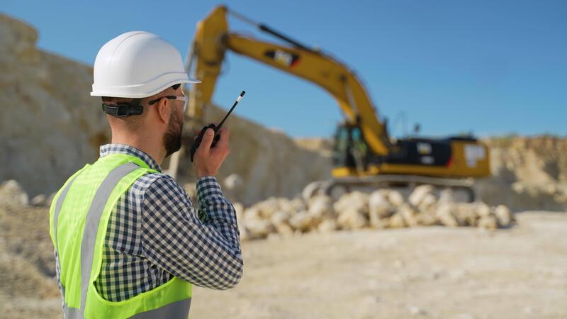 Engineer giving commands to employee in drilling machine using walkie talkie at quarry Pro Video