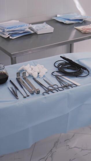 A table with surgical sterile instruments, scalpels and clamps. Action. Details of the operating room, prepared clean medical instruments, devices for a surgery and a bowl with iodine. Pro Video