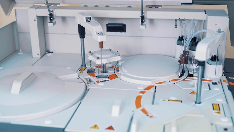 Modern robotic machine of checking blood samples in process in the laboratory. Analysis of liquid at medical clinic. Reseach and science concept. Slow motion. Pro Video