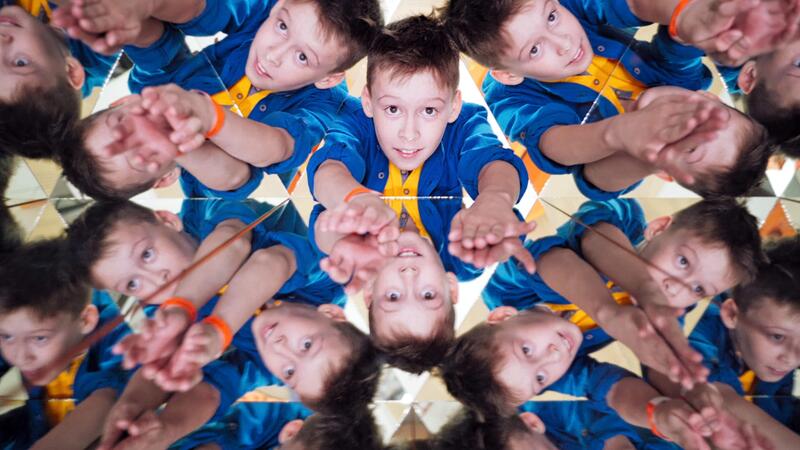 Many small triangles in kaleidoscope and curious boy in each one. Multicoloured pictures of a child in a kaleidoscope tunnel. Pro Video