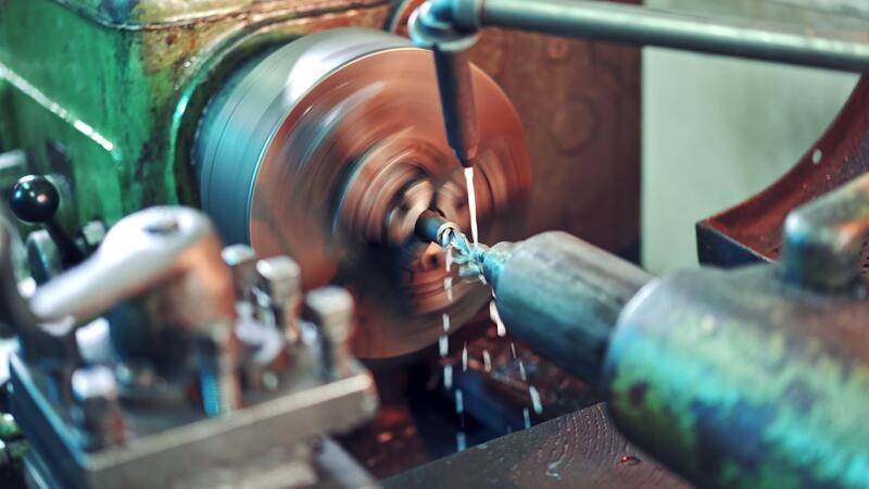 Lathe machine is turning while cutting metal on the workshop background. CNC milling machine on a factory. Metalwork Pro Video