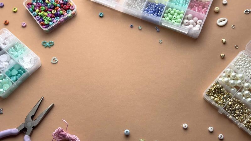 Crafting with colorful beads on a flat workspace with tools and containers in bright daylight Pro Video