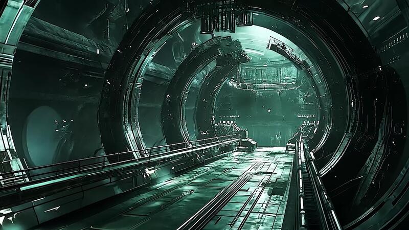 Dark and Mysterious Sci-Fi Tunnel Illuminated by Green Light, Showcasing Futuristic Architecture and Advanced Technology in an Industrial Cyberpunk Environment Pro Video