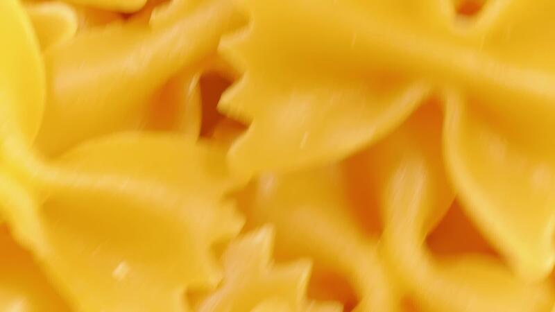 Uncooked Farfalle Pasta. A Culinary Canvas of Bow-Tie Macaroni, Creating a Lively and Textured Background for Gourmet Cooking - Top View, Rotating. Turning Dry Pasta. Raw Macaroni - Angular Rotation Pro Video