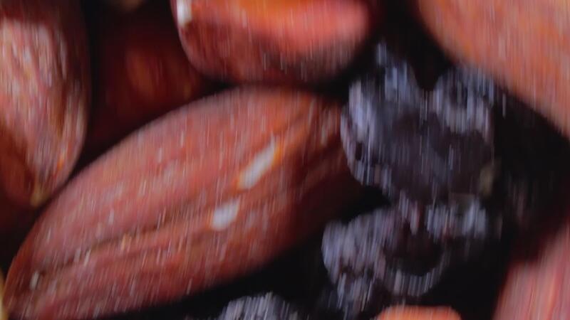 Mixed Nuts. Almonds, Walnuts, Cashews, Peanuts, Hazelnuts, Dried Prunes and Raisins - Rotating, Top View. Different Nut Mix Turning. Background from Various Nuts and Dried Fruits - Side Rotation Pro Video