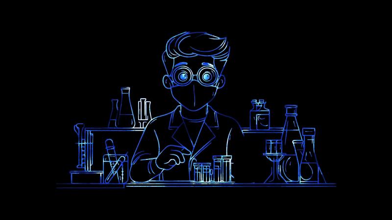 Neon frame effect, Scientist with test tubes, a microscope, and a lab coat on black background Free Video