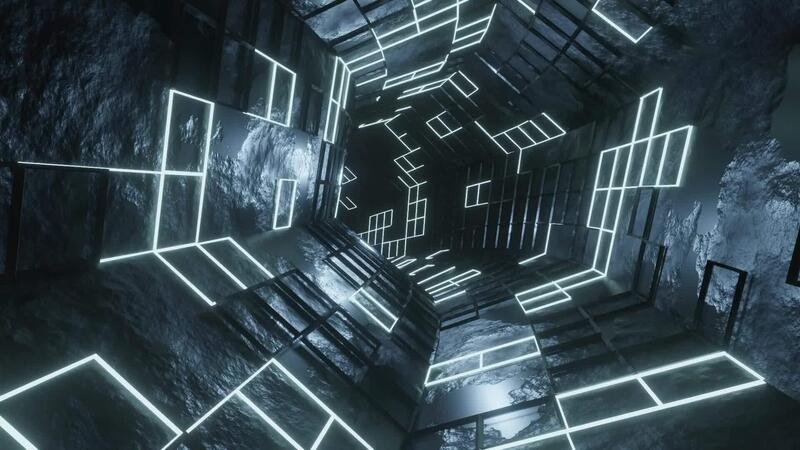 Futuristic hexagonal tunnel with black stone walls decorated with random glowing web framework. Smooth movement on the tunnel hole and find the round light. Free Video
