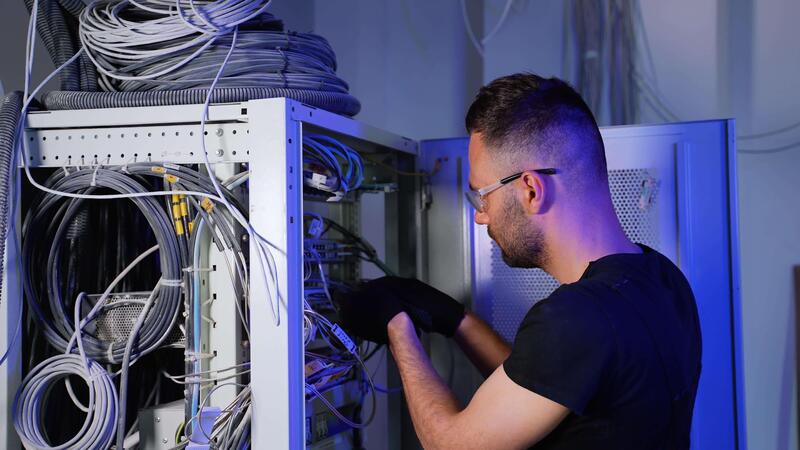 It specialist setting up server while working with data network Pro Video
