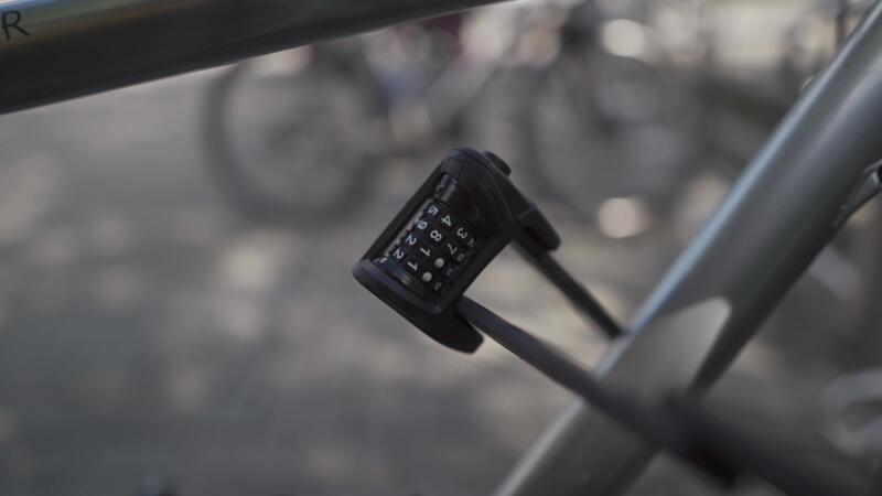 Securing bicycles against theft or stealing. Close-up of a folding metal combination lock on a bike. Cycle padlock with a password with four digits. Vehicle antitheft device for bicycles. Pro Video