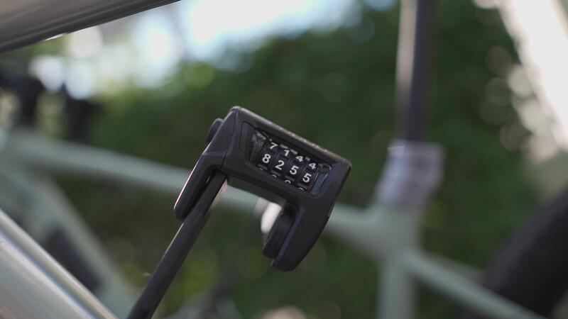 Protect bicycles from stolen or hijacked. Close-up of the code folding metal lock on the bicycle. Bike security lock with a four digit password segmented lock. Vehicle antitheft tool for bicycles. Pro Video