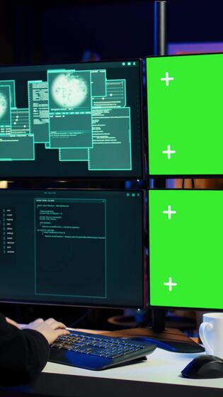 Vertical Cybercriminal using isolated screen PC in apartment hideout getting hacking attacks rejected by security. Hacker using chroma key computer monitor seeing access denied error message, camera B Pro Video