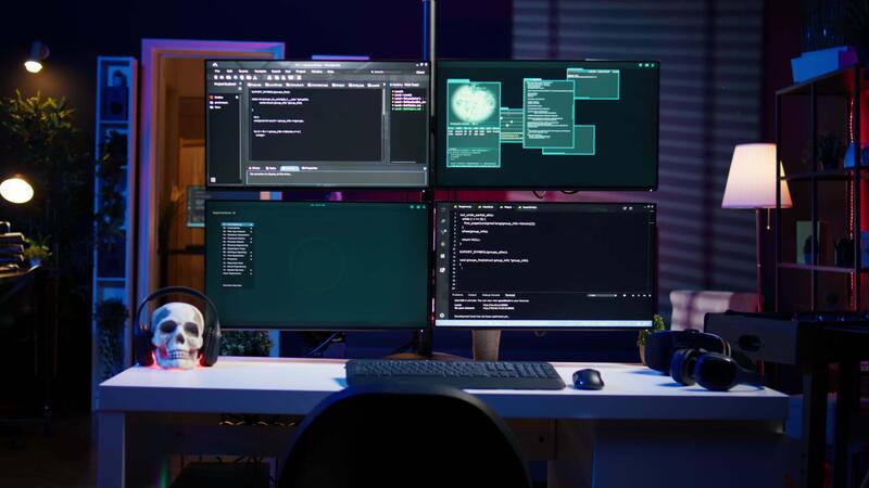 Code running on monitors in empty apartment used by hacker stealing state secrets from another countries. Malicious scripts on PC screens used by spy infiltrating governments Pro Video