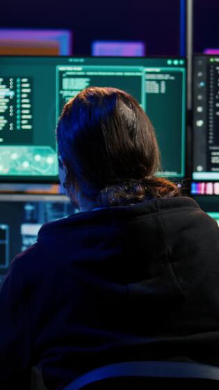 Vertical Rogue computer scientist uses AI machine learning to develop zero day exploit undetectable by antivirus. Hacker uses artificial intelligence neural networks to build script tricking firewall, camera B Pro Video