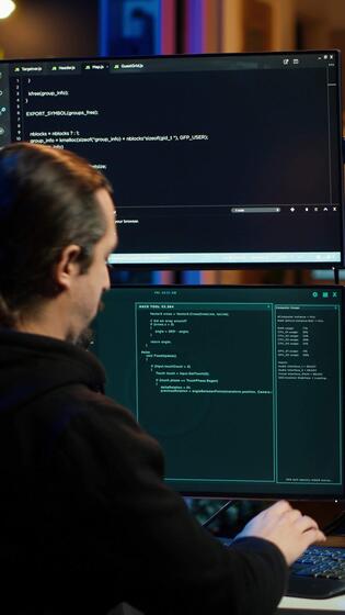 Vertical Happy hacker in secret hideout celebrating after managing to hide online activity after stealing data. Cheerful scammer feeling proud after successfully attacking victims using malware, camera A Pro Video