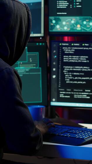 Vertical Evil cybercriminal using AI deep learning to produce virus corrupting data. Rogue programmer working on PC using artificial intelligence technology, penetrating security systems, camera A Pro Video
