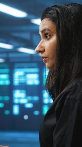 Vertical Meticulous engineer inspecting operational server rows in computer network security data center. Woman supervising supercomputers providing processing and memory resources for various workloads Pro Video