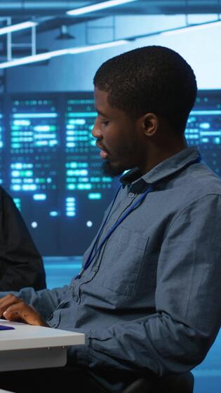 Vertical Multiracial team of IT engineers in server room brainstorming ways to fix equipment storing datasets. Indian and african american coworkers discussing how to mend racks doing computational operations Pro Video