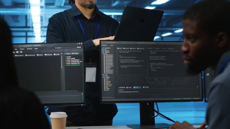 Manager in data center doing annual system review, checking parameters on laptop. Supervisor overseeing server clusters housing developed storage infrastructure used for workloads Pro Video