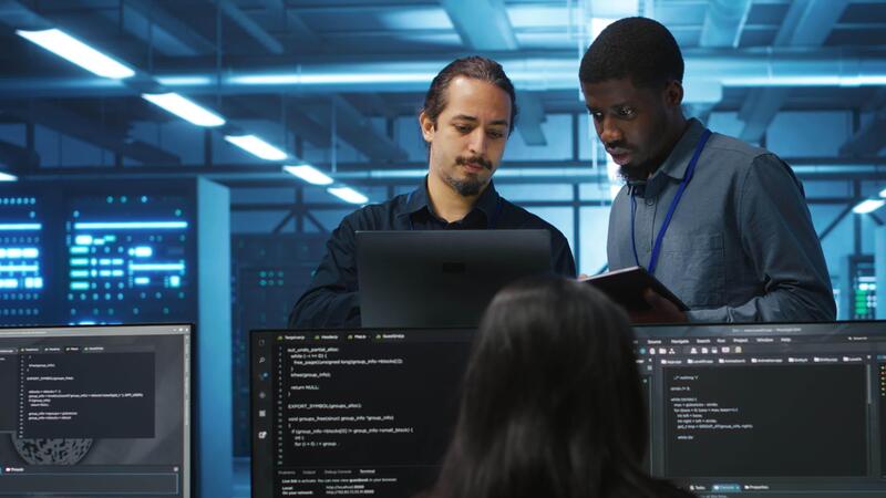 Multiethnic coworkers in server room collaborating to fix servers providing computing resources for workloads. Diverse team of admins supervising data center supercomputers Pro Video