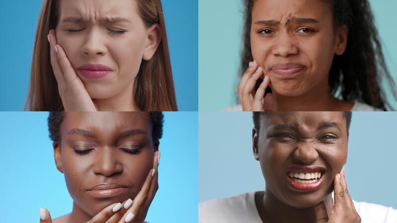 Four women convey different expressions of discomfort while touching their faces. Each has a unique reaction, showcasing a range of emotions on a soft blue background. Pro Video
