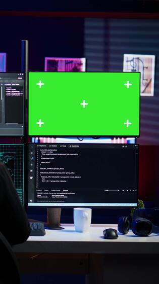 Vertical Cybercriminal uploading USB flash drive containing stolen information into green screen computer. Scammer inserting storage device into chroma key PC with data obtained from security breach, camera B Pro Video