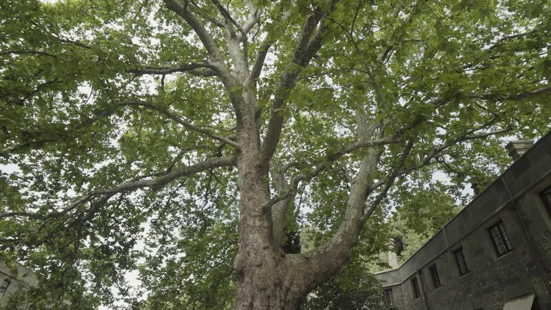 Walking under the summer tree. Action. Bottom view of the tree trunk and big branches with lush green leaves on cloudy sky background. Pro Video
