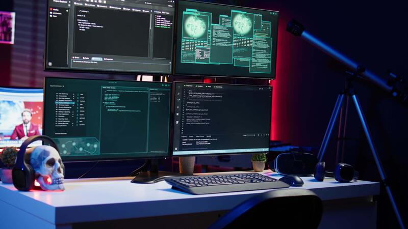 Close up of code running on computer displays in empty apartment used by hacker stealing secrets. Illegal scripts on PC screens used by spy infiltrating governments, handheld camera shot Pro Video