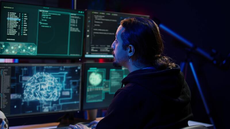 Hacker drinking coffee while running artificial intelligence spyware software designed to gather information from users. Script kiddie doing illegal stuff using AI, consuming beverage, camera B Pro Video