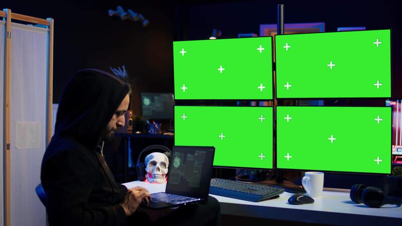 Man writing code on laptop in front of isolated screen PC monitors, trying to get past security systems. Hacker using chroma key computer and notebook to make scripts that can hack devices, camera B Pro Video