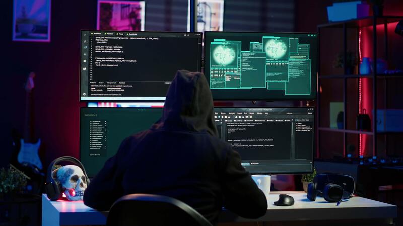 Happy man writing code on PC, celebrating after managing to get past security systems. Hacker using computer to make scripts that can hack devices, feeling proud after breaching firewall, camera A Pro Video