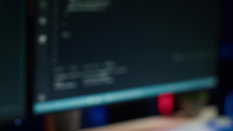 Extreme close up of software interface on PC screens showing lines of code running in empty criminals den. Hacking malware programming script on displays in underground base, handheld camera shot Pro Video