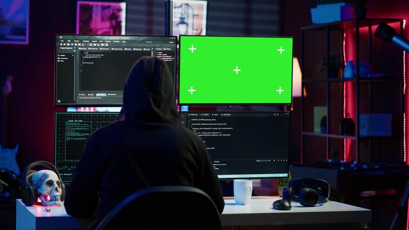 Cybercriminal uploading USB flash drive containing stolen information into green screen computer. Scammer inserting storage device into chroma key PC with data obtained from security breach, camera A Pro Video