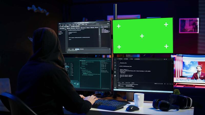 Dangerous man hacking using green screen PC, stealing credit card numbers and infiltrating banking systems. Hacker running code in apartment on mockup computer display, camera B Pro Video