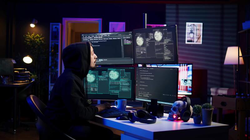 Hacker getting angry after failing to successfully develop spyware software stealing data. Frustrated scammer upset after written malicious code proves to be unsuccessful, camera B Pro Video