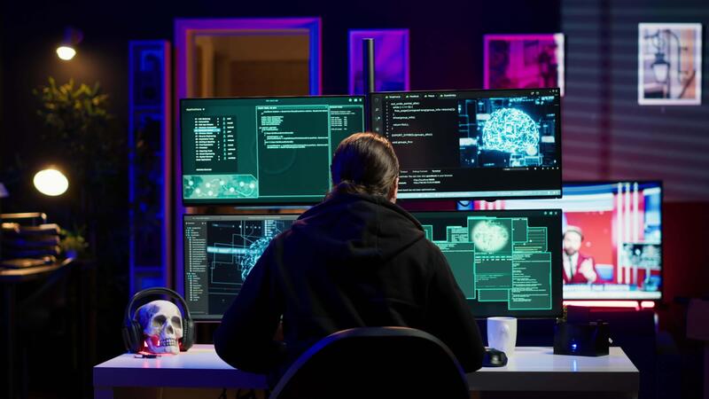 Hacker in hideout interrupted by police sirens from writing malware code on computer, running to escape before getting caught. Criminal den found by anti hacking law enforcement, camera A Pro Video
