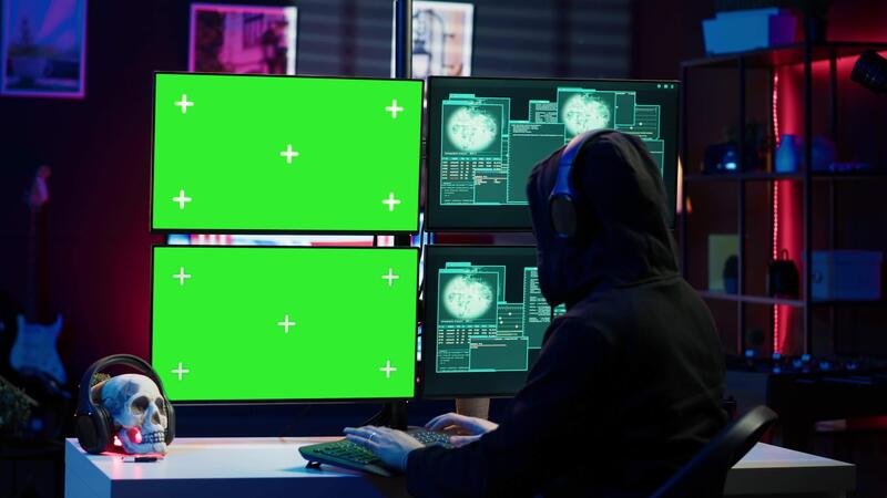 Happy man writing code on green screen PC, celebrating after managing to get past security systems. Joyous hacker feeling proud after breaching firewall using mockup computer, camera A Pro Video