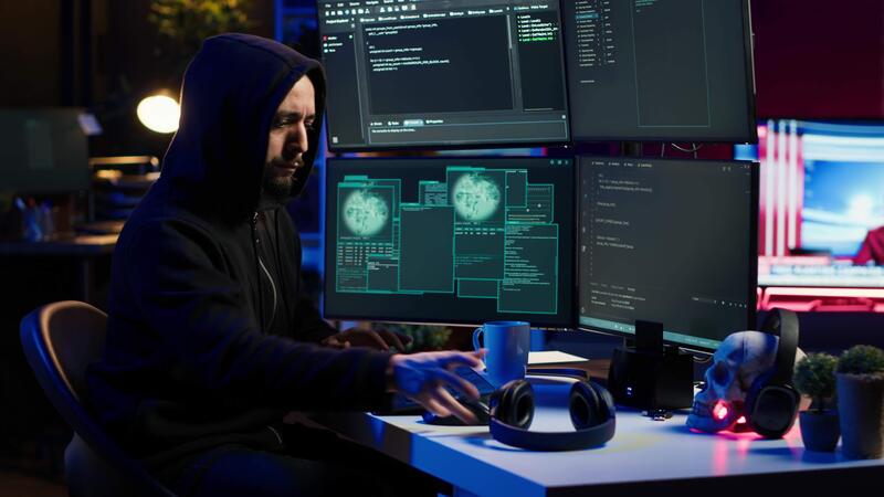Hacker stealing credit card numbers while listening music through headphones. Evil developer programming in apartment, infiltrating banking systems, hearing songs, camera A Pro Video
