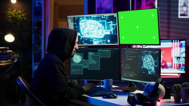 Hacker using green screen PC and AI to find unpatched connections and steal data. Scammer using artificial intelligence and chroma key computer to compromise digital devices, camera A Pro Video