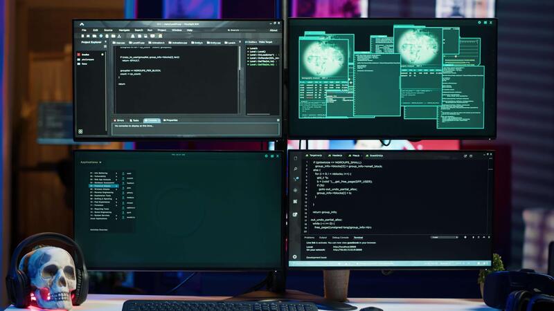 Code running on monitors in empty apartment used by hacker stealing state secrets from another countries. Malicious scripts on PC screens used by spy infiltrating governments Pro Video