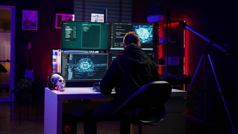 Hacker in hideout interrupted by police sirens from writing malware code on computer, running to escape before getting caught. Criminal den found by anti hacking law enforcement, camera B Pro Video