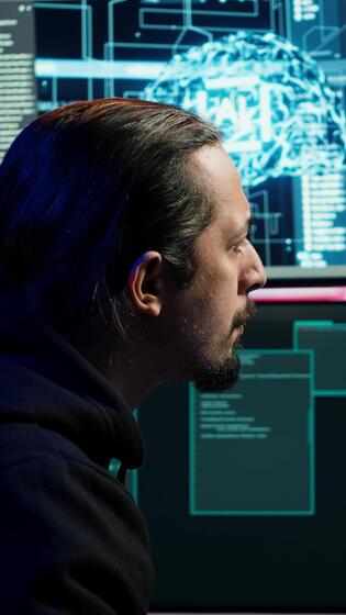Vertical Hacker using artificial intelligence technology to write spyware software able to gather information from users. Scammer in apartment doing fraud using AI, close up, camera A Pro Video