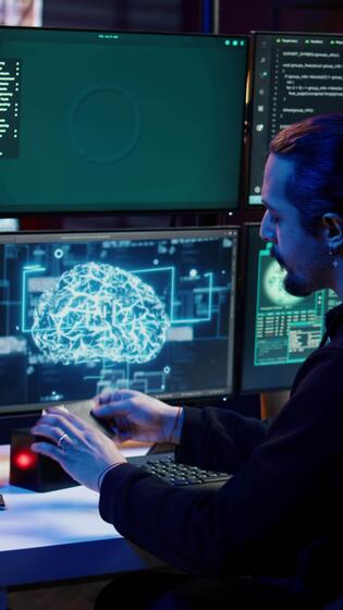 Vertical Hacker uploading script on SSD that can launch DDoS attacks on any website. Cybercriminal writing program that can crash servers, downloading it on storage drive, camera B Pro Video