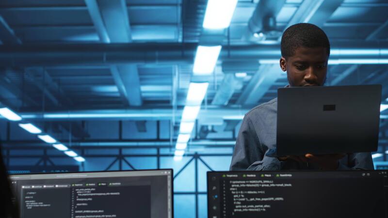 Portrait of happy manager supervising server rows in computer network security data center. Smiling african american supervisor and employees overseeing supercomputers in server hub Pro Video