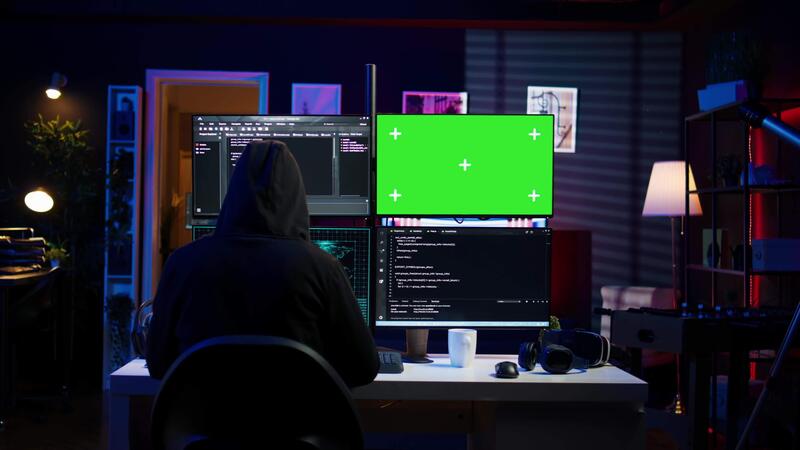 Cybercriminal uploading USB flash drive containing stolen information into green screen computer. Scammer inserting storage device into chroma key PC with data obtained from security breach, camera B Pro Video